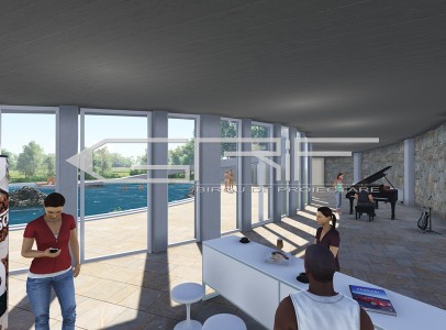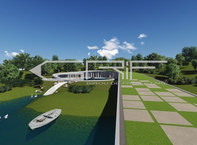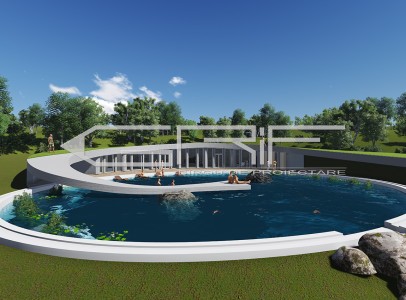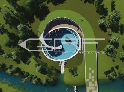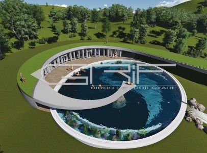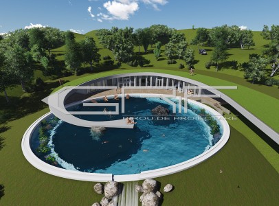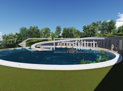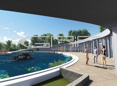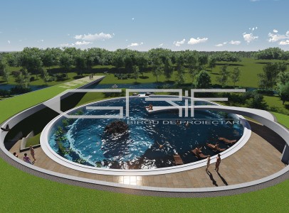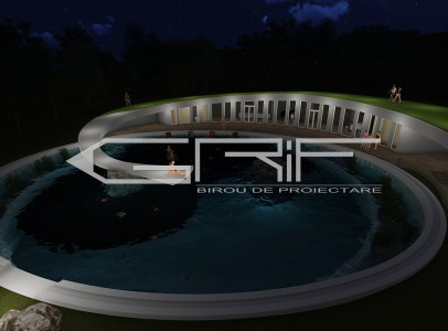 Eceste constructii reprezinta o zona al uni complex de odihna. Bazinul are o forma ogivala cu simbolul ”in jan” inscris in el. Constructia auxiliara isi i-a inceputul de pe malul vecin si se finiseaza cu un pod in mijlocul bazinului. In el sunt amplasate dusurile, blocurile sanitare, incaperi tehnice, sala de odihna si zona barului.