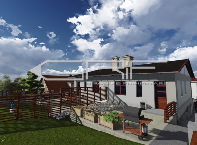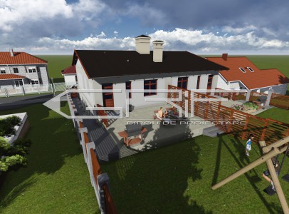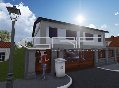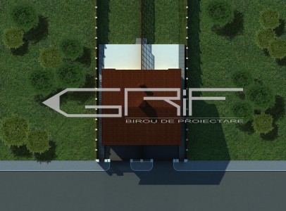 O casă pentru două familii, economă si compactă. Dimensiunele în plan sunt de 14x12m. La demisol pentru fiece familie putem vedea un garaj pentru 2 mașini și un depozit; iar la parter 1 dormitor, birou, bucătarie+salon și bloc sanitar.